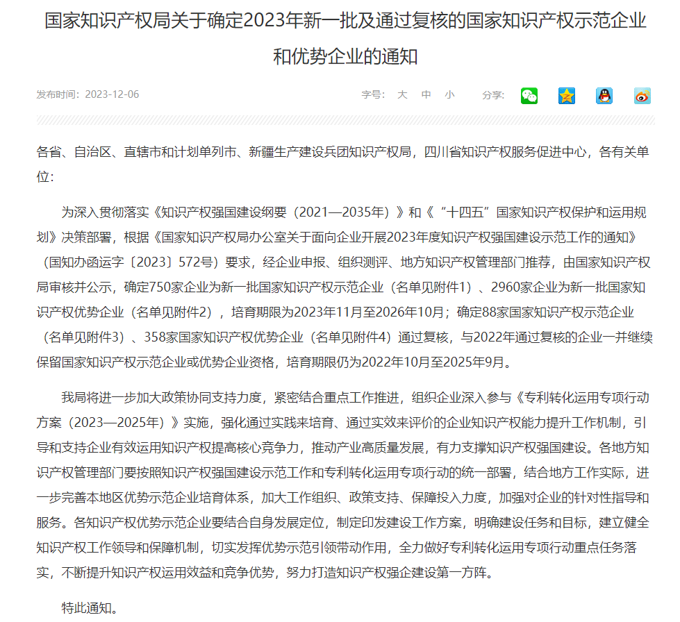 2023年12月06日,国家知识产权局发布了“国家知识产权局关于确定2023年新一批及通过复核的国家知识产权示范企业和优势企业的通知”,青岛东海药业有限公司(以下简称“公司”)荣膺“国家知识产权示范企业”称号。